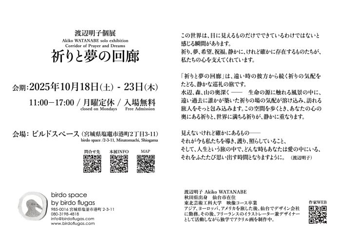 情報デザイン学科映像コース(現映像学科)卒業生の渡辺明子(わたなべ・あきこ)さんが10月18日よりビルドスペース(宮城県塩釜)を会場に個展「祈りと夢の回廊」を開催されます。ぜひ足をお運びください。