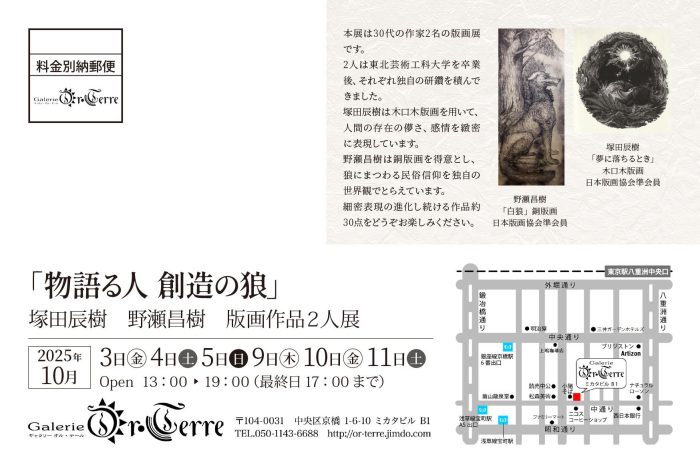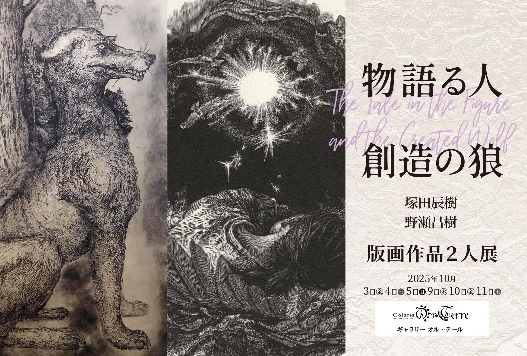 卒業生の塚田辰樹さんと野瀬昌樹さんが10月11日まで版画作品2人展「物語る人 創造の狼」を開催中です