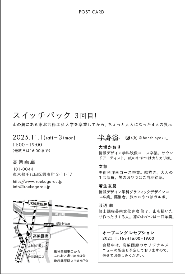 卒業生4名によるグループ展「スイッチバック3回目!」が11月1日より開催されます