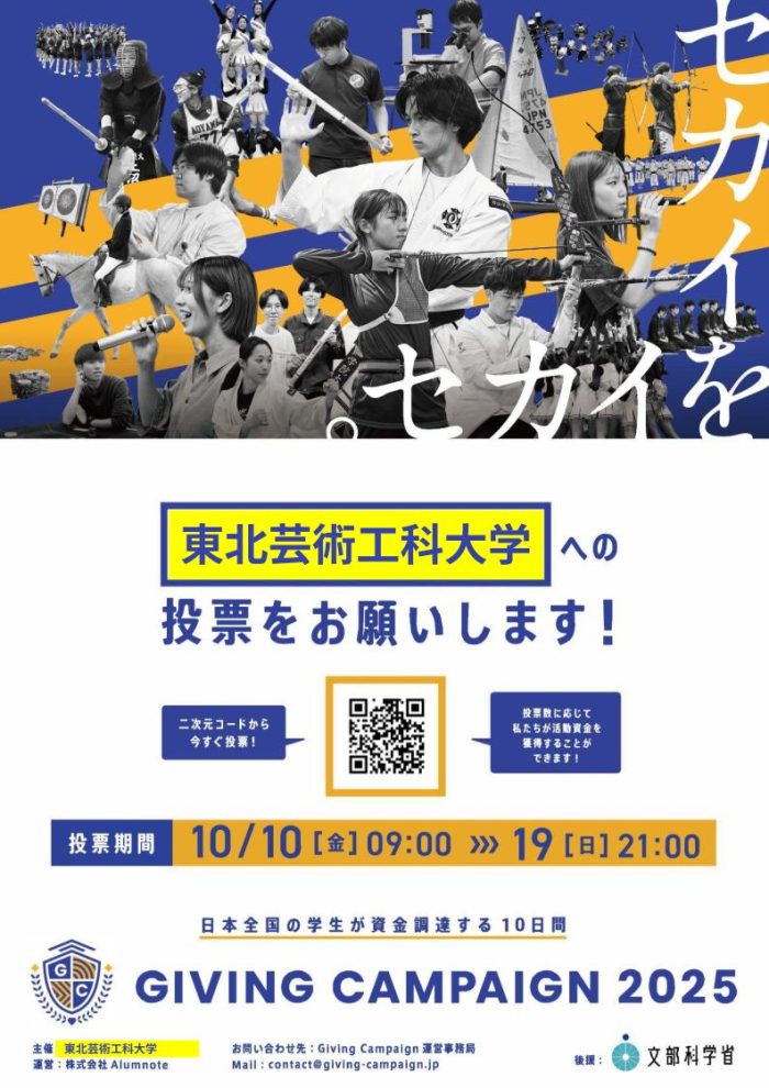 芸工大は全国110大学で開催される学生による資金調達イベント「Giving Campaign2025」に参加し、卒業/修了制作・研究展や課外活動への支援を目的に10団体の学生が資金調達を行っております。