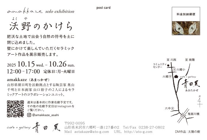 大学院日本画領域修了生の山口裕子(やまぐち・ゆうこ)さんのコラボレーションユニットamakkazeが10月15日よりcafe&gallery青田風(山形・米沢)を会場に個展「沃野のかけら」を開催されます。ぜひ足をお運びください。