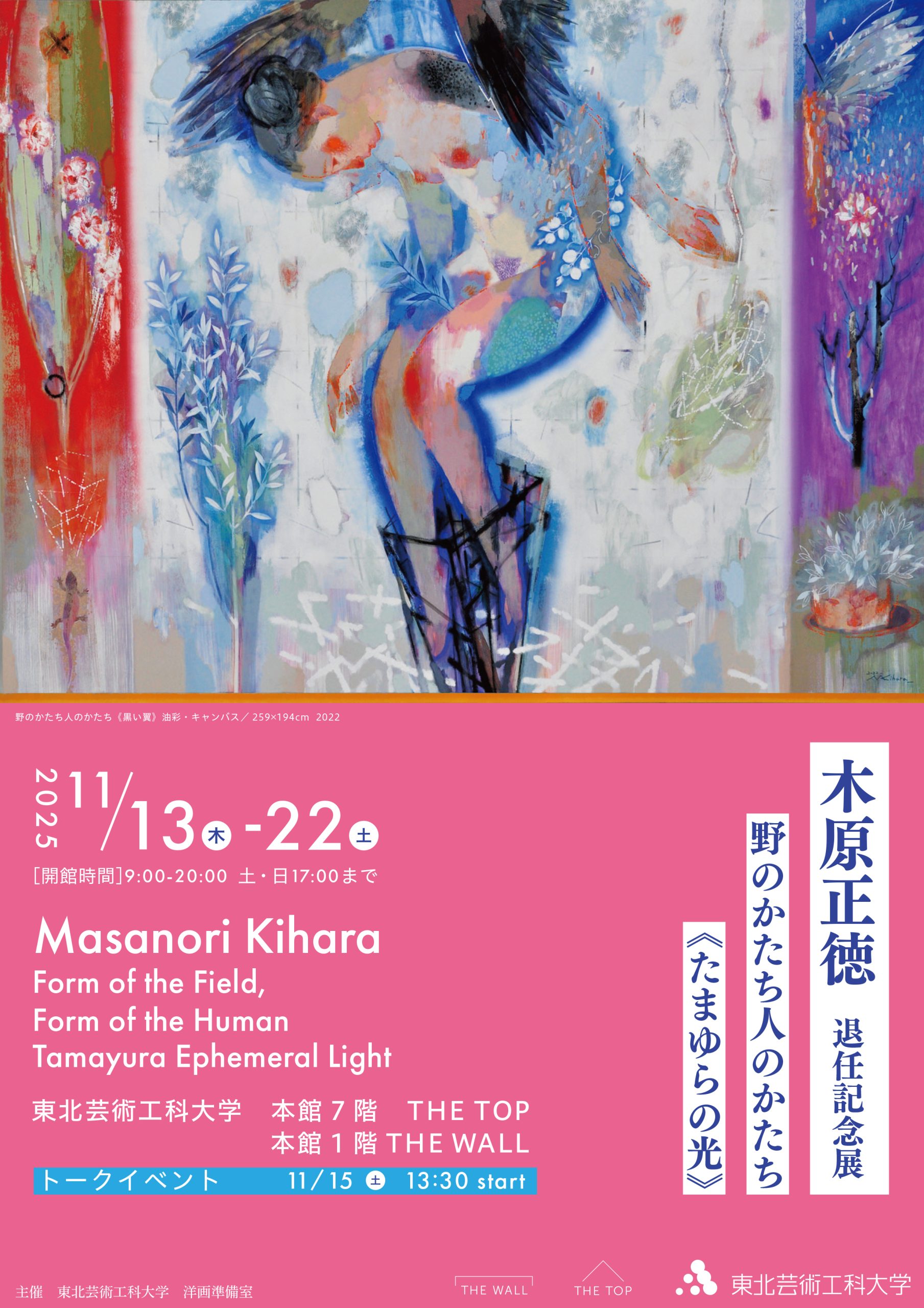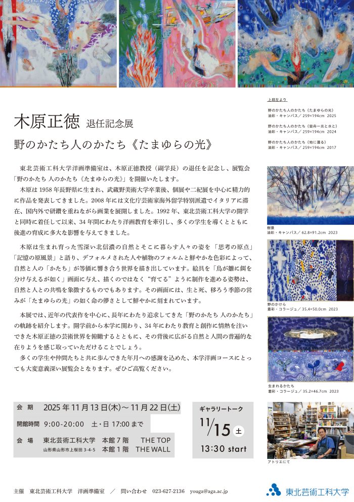 11月13日より東北芸術工科大学本館7階 THE TOP、本館1階 THE WALLを会場に洋画コース木原正徳教授の退任記念展「野のかたち人のかたち《たまゆらの光》」が開催されます。11月15日にはギャラリートークも予定しております。ぜひ足をお運びください。