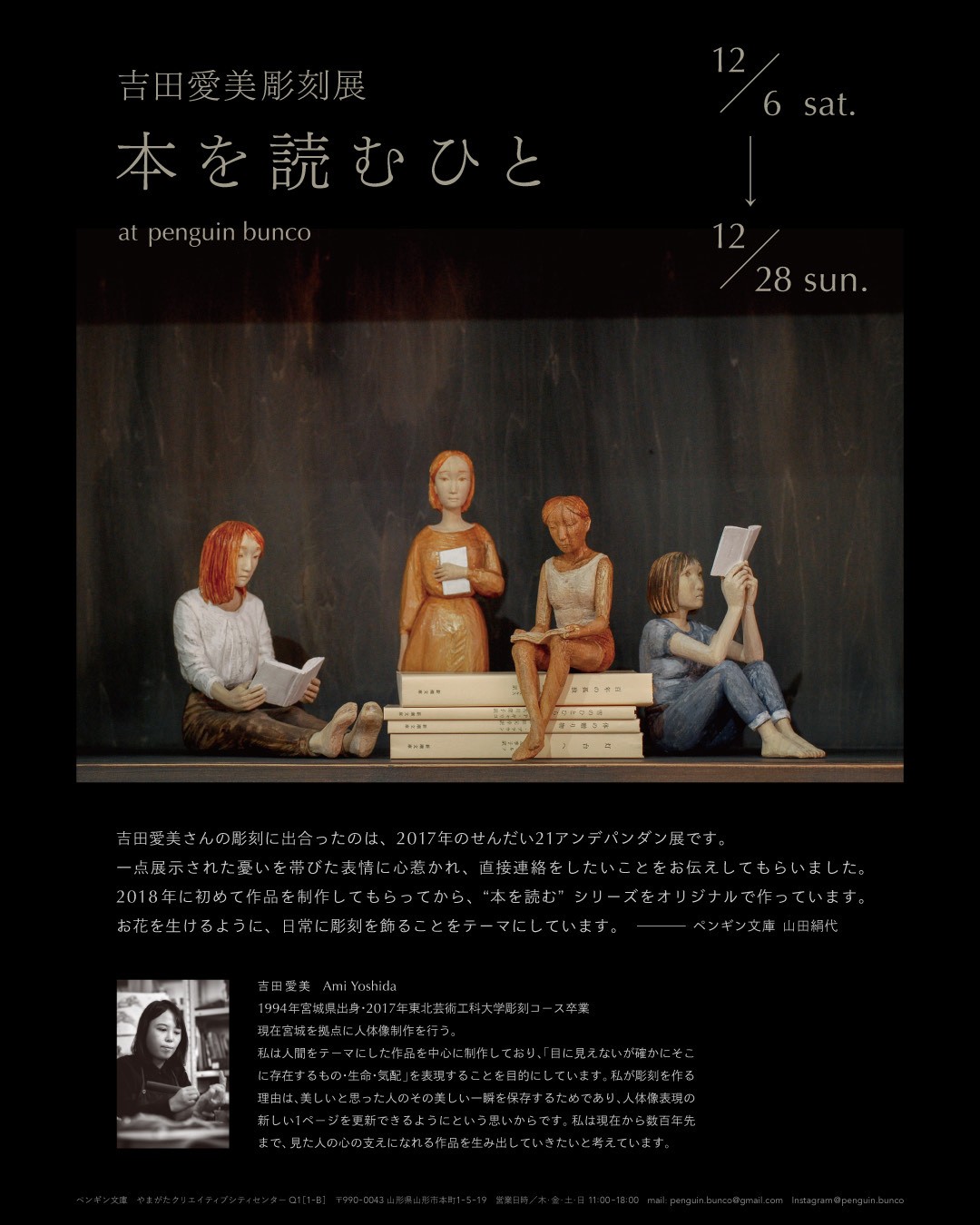 彫刻コース卒業生の吉田愛美(よしだ・あみ)さんが12月6日よりペンギン文庫(山形県・山形市)を会場に個展「本を読むひと」を開催中です。ぜひ足をお運びください。