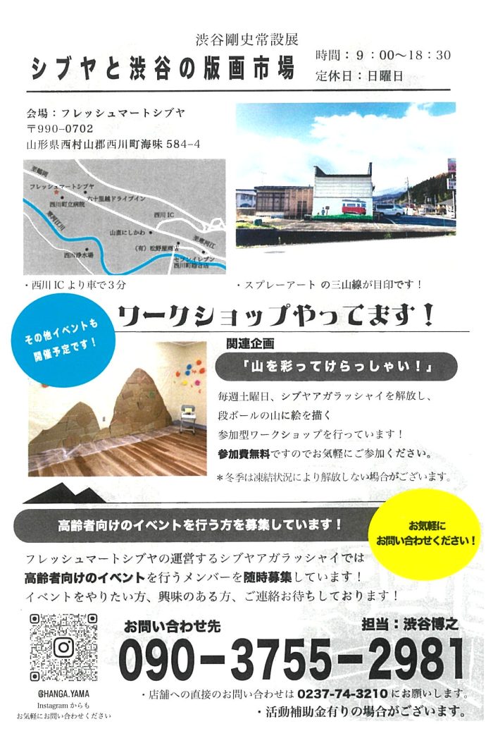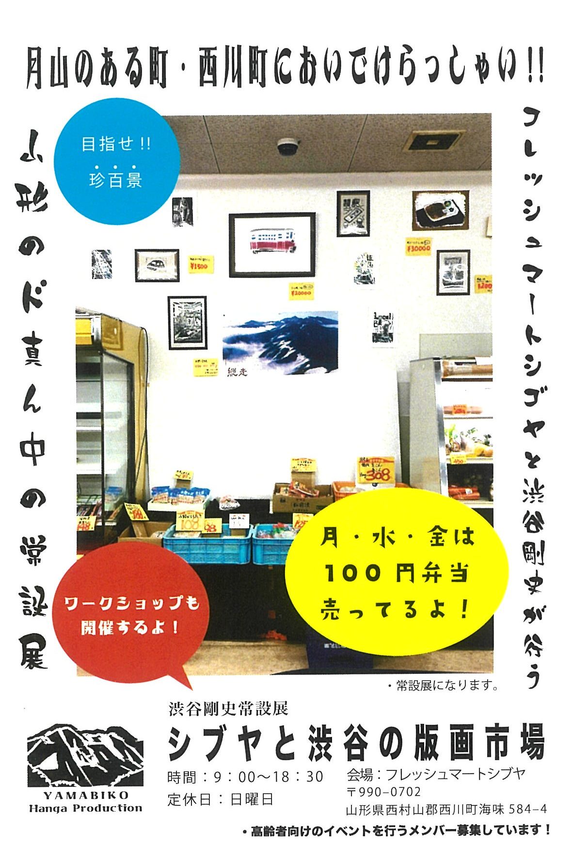 大学院芸術総合領域修了生の渋谷剛史(しぶや・ふみたけ)さんがフレッシュマートシブヤ(山形県・西川町)を会場に「シブヤと渋谷の版画市場」を常設展示しております。ぜひ足をお運びください。