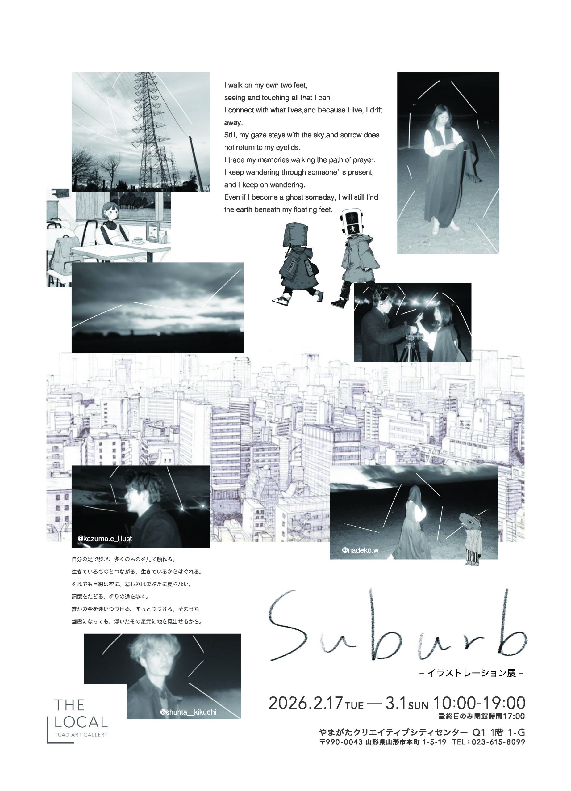本学映像学科卒業生の菊地俊太(きくち・しゅんた)さん、グラフィックデザイン学科卒業生の遠藤一馬(えんどう・かずま)さんが2月17日よりクリエイティブシティセンターQ1 THE LOCAL TUAD ART GALLERY (山形県・山形市)を会場に「Suburb -イラストレーション展-」を開催されます。ぜひ足をお運びください。