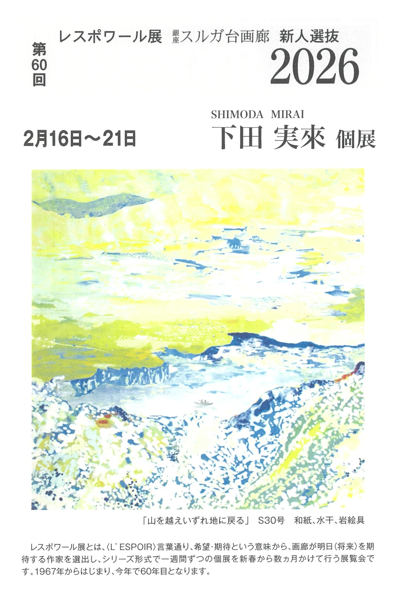 大学院絵画領域修了生の下田実來(しもだ・みらい)さんが2月21日まで銀座スルガ台画廊(東京・銀座)を会場に、銀座スルガ台画廊 新人選抜展「下田実來個展」(第60回レスポワール展2026)を開催中です。ぜひ足をお運びください。