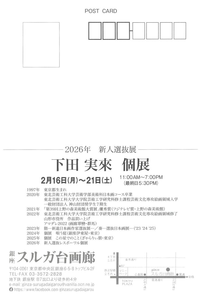 卒業生の下田実來さんが2月21日まで2026年新人選抜展「下田実來個展」を開催中です